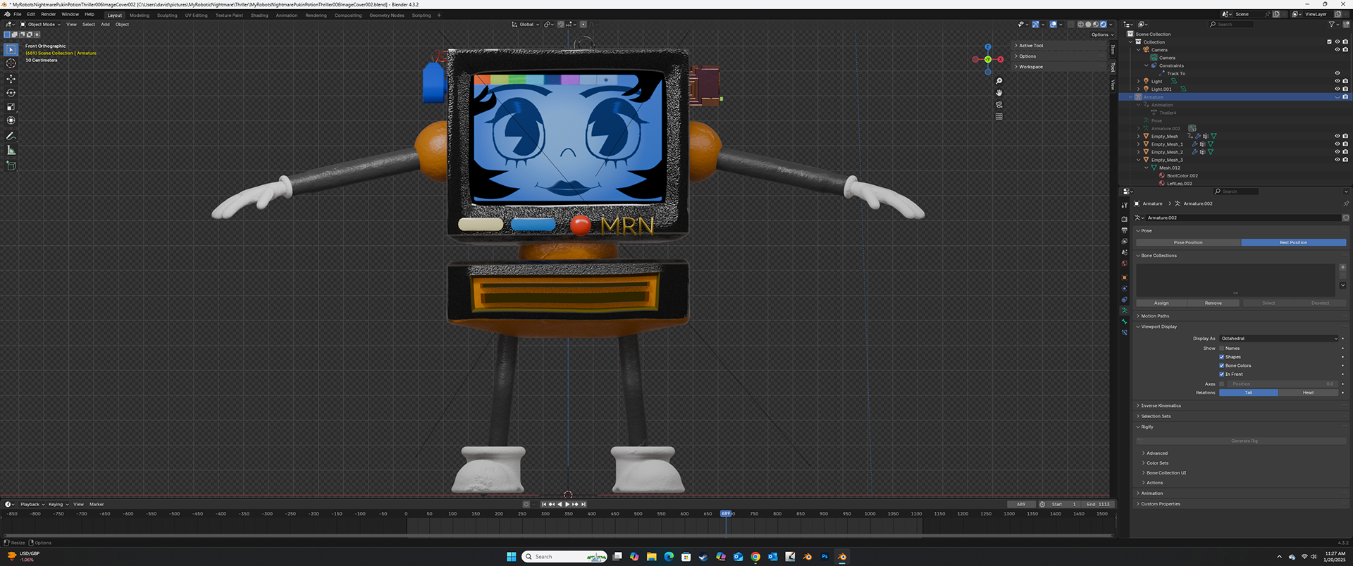 I’ve been working on an indie game called “My Robotic Nightmare” (MRN) – a tentative title – which is essentially a survival game where the player faces off against a Digital Overlord powered by AI. The game is being developed in Epic’s Unreal Engine, with 3D content created in Blender 4.3. A key focus is creating believable characters using advanced procedural shaders that can be developed in Blender and transferred to Unreal Engine while preserving as much material depth as possible. I’ve also expanded my 3D modeling skills with procedural graphic generation in Blender 4.3 and other platforms, allowing me to create game assets with more dynamic detail and enhance the overall look of my models, improving the visual quality of both the game and other graphic assets.